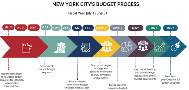 In January, the New York Mayor releases a preliminary budget that outlines goals and funding allocations for the coming fiscal year. This includes a financial plan covering economic and revenue forecasts, five-year agency summaries, and other information; a summary of savings initiatives implemented across city agencies; departmental estimates; and other information. From March to April, the City Council analyzes the preliminary budget and convenes a series of hearings with city agencies, community boards, advocates, and residents. At the conclusion of the hearings, the city council is required to issue a formal response to the Mayor’s preliminary budget that includes suggested revisions and provides updated financial data. This essentially serves as the City Council’s version of the proposed budget.