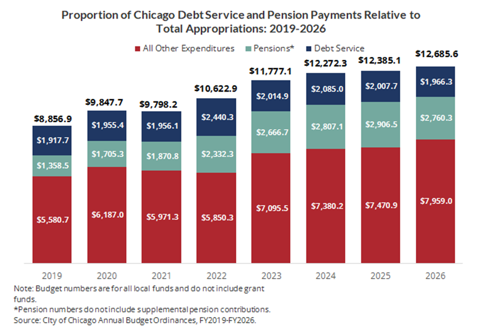 Because the City has left its structural deficit unaddressed, spending continues to grow year over year without sufficient, sustainable revenues to cover rising costs. As the Civic Federation noted in an October report, Chicago’s budget has increased 40% since 2019, excluding grant funds. Much of this growth is attributed to legacy costs—pension contributions and annual debt service expenditures—that are fixed and therefore non-discretionary. The largest driver of the spending increase, pensions, accounted for a $1.5 billion increase over the six-year period, driven by rising obligations and supplemental payments. Many of these increases were mandated by the State and are needed to keep the City compliant with the State-imposed funding schedule.[1]