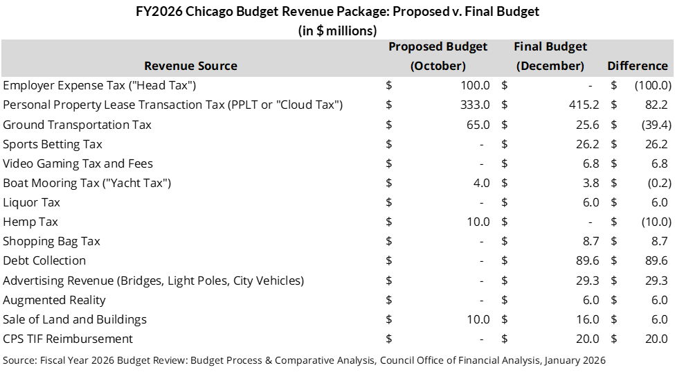 The Chicago City Council closed a projected $1.2 billion budget gap by adopting a $16.6 billion budget for FY2026 in late December, rejecting the budget the Mayor had proposed in October. The budget falls short in the following ways: