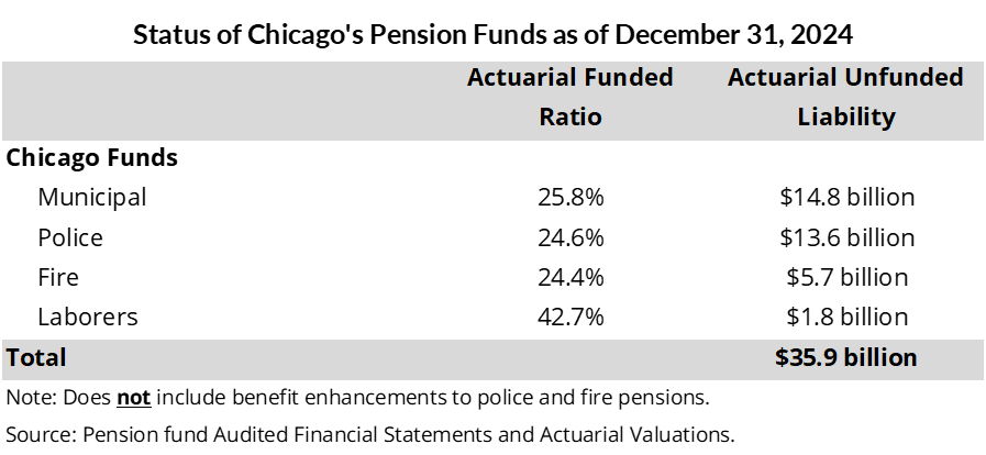 The funding situation has grown even worse following the passage of a bill (HB3657) in the spring 2025 legislative session that boosts pension benefits for Tier 2 Chicago police officers and firefighters (those hired since 2011). In July, the Governor signed legislation increasing benefits for Chicago police and firefighters in an attempt to ensure that retirement benefits meet the requirements of Social Security Safe Harbor and to bring parity with downstate first responders under Tier 2 pension plans. However, this pension sweetener threatens to push the City’s funds into insolvency. The cost of the added benefits is estimated to exceed $11 billion and add to the City’s unfunded liabilities over the next 30 years, and the funded ratio of the two funds has now dropped below 18%.