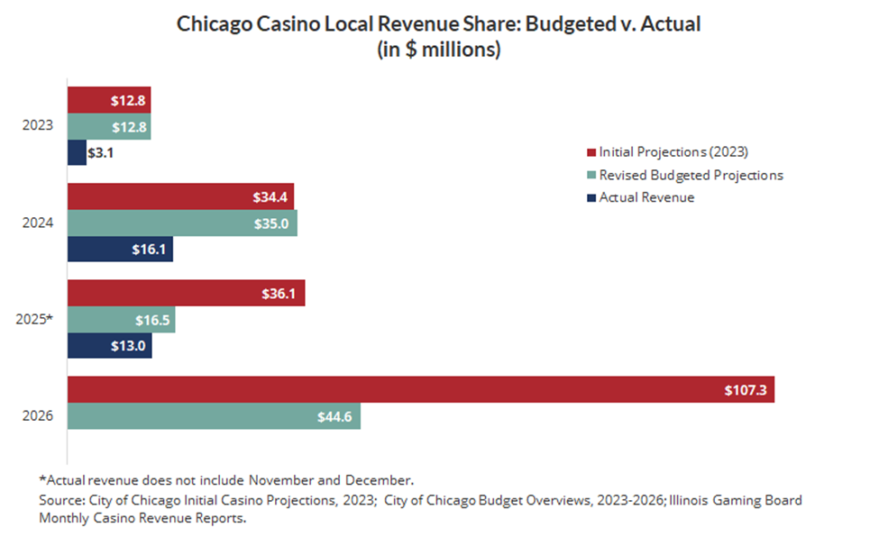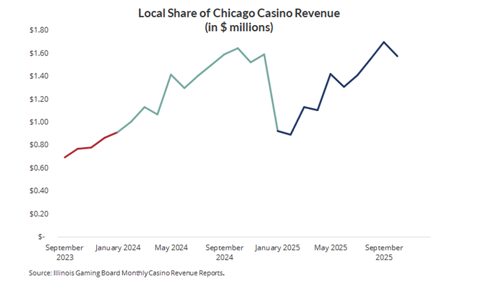 Since opening in September 2023, Chicago’s temporary casino has consistently underperformed revenue expectations. Presented as a potential windfall to support Chicago’s underfunded police and fire pensions, every month since its opening, the City has reported revenues far short of initial projections. These initial projections were revised significantly downward in each subsequent year’s budget, and revenues frequently fail to meet even the reduced expectations. Despite this low performance to date, and with the permanent casino site still under construction, the City’s FY2026 proposed budget assumes a 170% increase in casino revenue over FY2025.