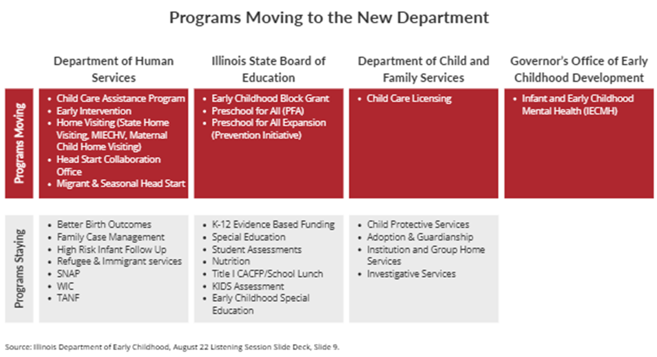 IDEC will also take on responsibility for childcare (day care) licensing from the Department of Children and Family Services (DCFS). In addition, Infant and Early Childhood Mental Health (IECMH) functions previously housed within the Governor’s Office of Early Childhood Development (GOECD) are expected to be integrated into the new department.