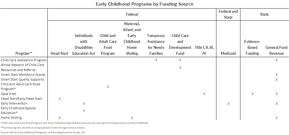 The following figure shows the many types of federal and state funding sources that currently flow to various early childhood programs offered in Illinois.