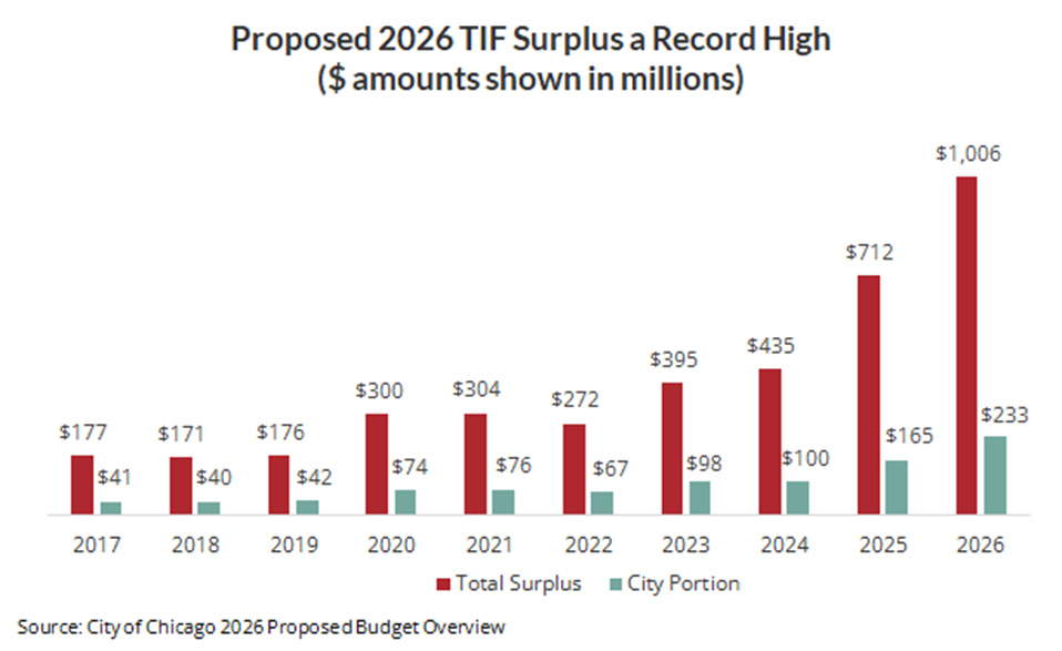 In October of 2025, Mayor Brandon Johnson released his proposed 2026 budget, which aims to close a deficit of over $1.2 billion as is required by state and municipal law. One component of the budget is a $1.01 billion Tax Increment Financing (TIF) District surplus, which will generate an estimated $232.6 million in revenue for the City of Chicago (Chicago or ‘the City’). TIF districts are supposed to segment and dedicate a portion of property tax collections within a designated “blighted” geographic area to fund economic development and capital or infrastructure projects. State law mandates that any excess funds in each TIF district be released from the fund and distributed annually to all local government entities within Chicago—a process known as a surplus. The City of Chicago declares the total TIF surplus, and the Cook County Treasurer distributes it to taxing agencies based on their share of total property taxes billed. As with the rest of the proposed 2026 budget, the TIF surplus must be passed by the Chicago City Council before it becomes law and is executed.
