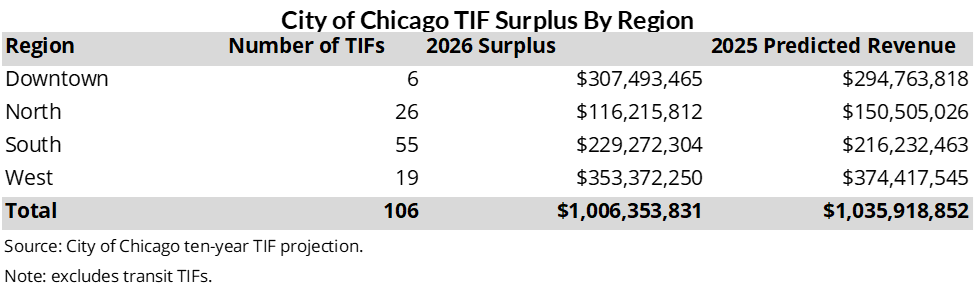 The following table breaks down the surplus by region within the City. The size of the TIF surplus from these areas largely mirrors where TIFs are most concentrated.[1]